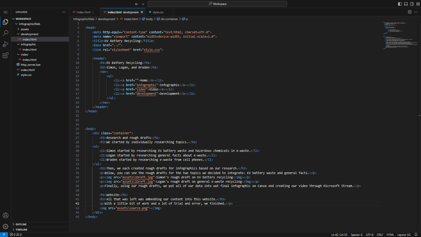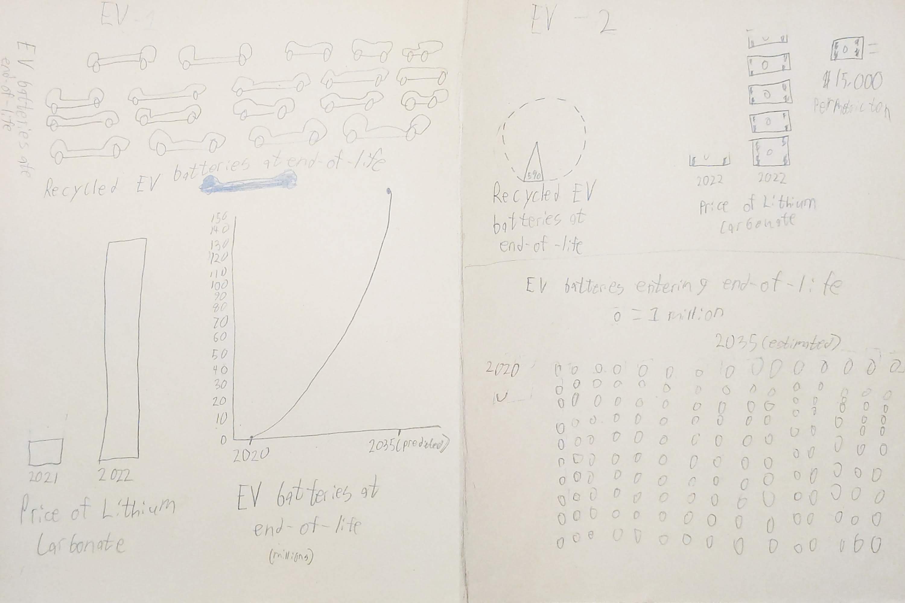 Below, you can see the rough drafts for the two topics we decided to integrate: EV battery waste and general facts.